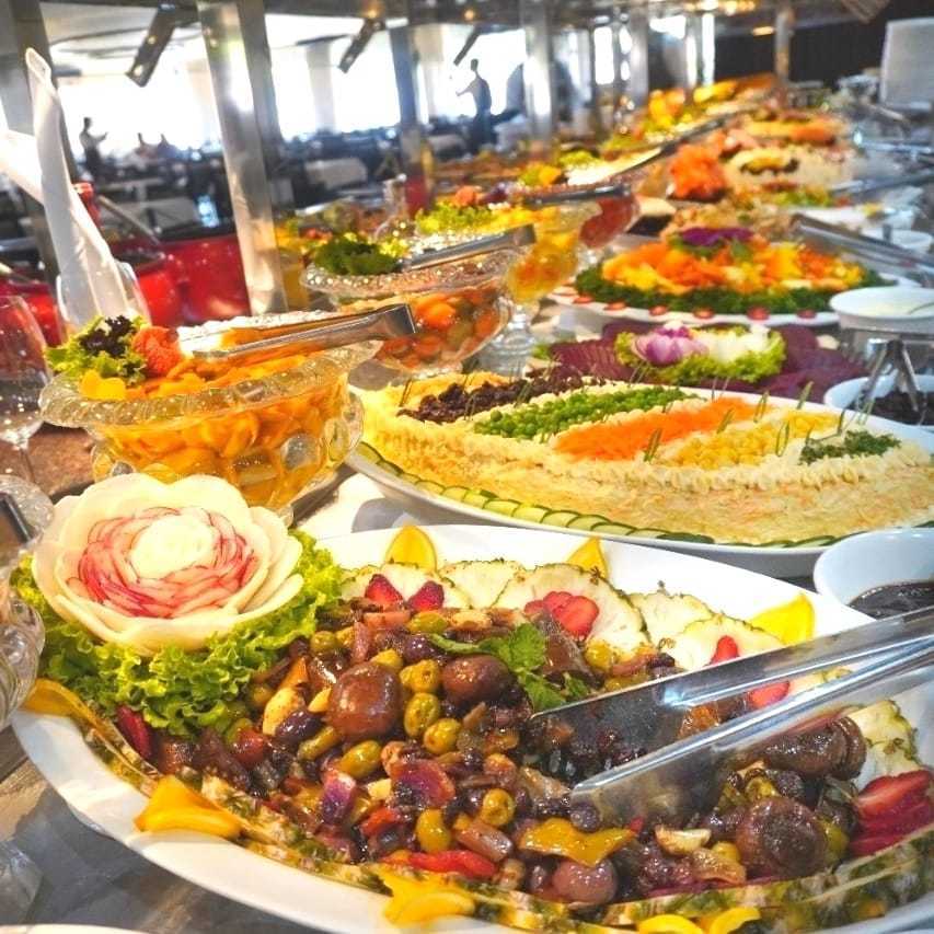 Além de poder desfrutar dos deliciosos acompanhamentos servidos no buffet. São opções que vão de queijos raros, passando por presunto parma e o famoso (e caro) pata negra, até uma mesa de sushis, peixes como bacalhau e salmão, camarão, saladas e várias outras opções de carboidratos e proteínas.