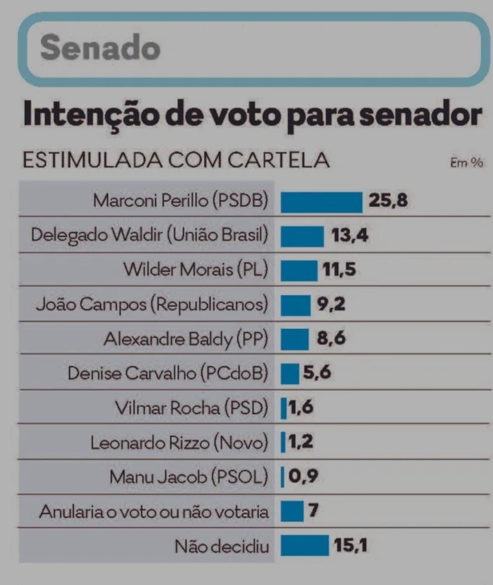 A dois dias das eleições, o tucano tem 25,8% das intenções de contra, bem à frente do segundo colocado, o deputado federal Delegado Waldir (União Brasil), que registrou 13,4%. A diferença entre eles é de 12,4%.